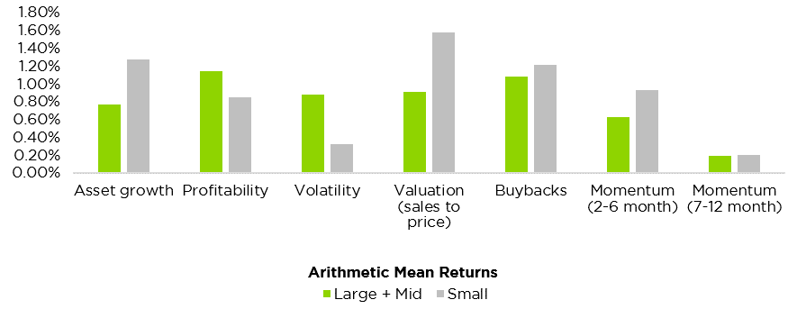 Academic research has established the presence of many investment anomalies – variables that drive stock returns because of market frictions and human psychological biases. For several well-known anomalies, we modeled portfolios that were long the stocks with the greatest exposure to positive factor/anomaly characteristics and short the stocks with exposure to negative characteristics. The below chart shows that small cap had greater exposure to anomalies such as asset growth, profitability, valuation, and momentum: