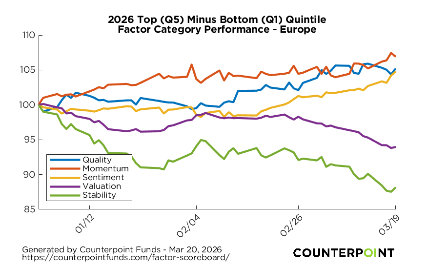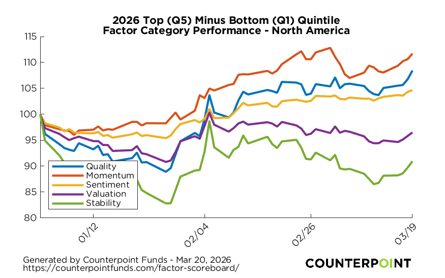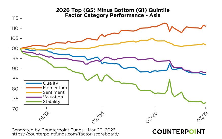 As of March 11, 2026, year-to-date factor performance has been characterized by strong momentum leadership, improving quality exposure in developed markets, and persistent underperformance of
