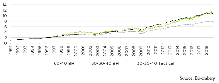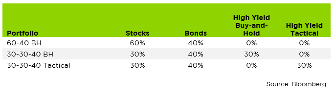 It turns out allocating away from an equity index and toward a tactical high yield strategy can modestly improve returns while potentially reducing portfolio risk. We evaluated historical returns for three types of portfolios: a traditional 60%-40% allocation between stocks and U.S. Treasuries; a passive buy-and-hold allocation to 30% stocks, 30% buy-and-hold US high yield corporate debt, and 40% U.S. Treasuries; and a portfolio with a passive buy-and-hold allocation to 30% stocks and 40% U.S. Treasuries, with the remaining 30% of assets invested in a tactical high yield.