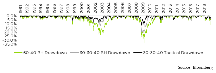 Drawdown: Impact of Replacing 50% of Equity Allocation with Tactical High Yield (1991-2018)
