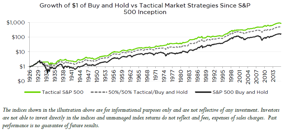 Displayed with a logarithmic scale, we modeled the system (Tactical S&P 500) since the inception of the S&P 500, alternating between the total return of the S&P 500 index and an approximation of holding short term treasuries by earning a monthly yield equivalent to the 3-month US treasury interest rate. Monthly S&P 500 data since inception in 1926 was provided by CRSP, with treasury data from the St. Louis Fed.