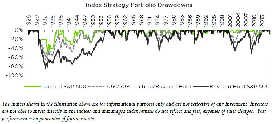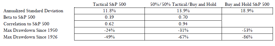 Tactical approaches may serve to help diversify a portfolio and improve risk traits. A combined strategy that evenly weights and monthly rebalances the S&P 500 with a tactical approach lowered standard deviation from 18.9% to 13.9%, lowered beta exposure to 70% on average while retaining substantial overall correlation of 94%, and amazingly cut maximum drawdown from 53% to 31% (in 1950 to present period).