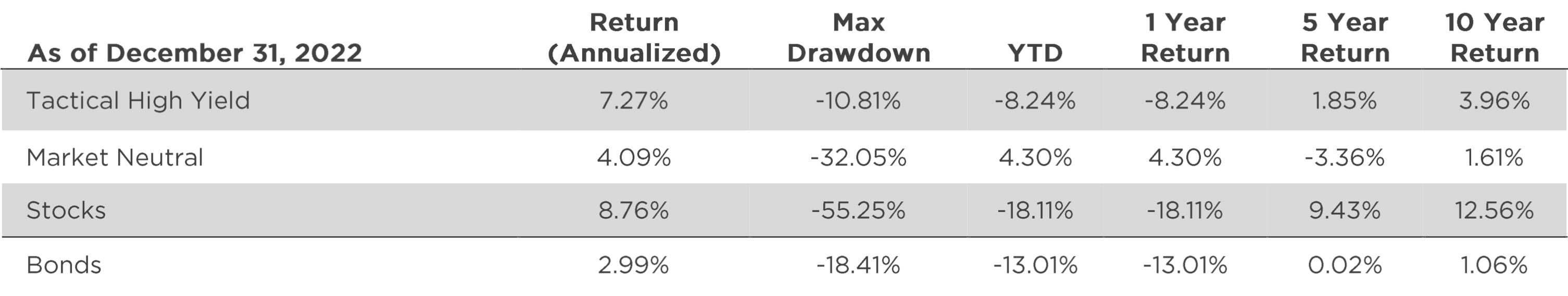Source: Bloomberg, Morningstar. The “Stocks” is completely composed of the S&P 500 Index. “Bonds” is made up of the Bloomberg Barclays Aggregate Bond Index. “Tactical High Yield” is composed of the Tactical High Yield 200-DMA. The 200-DMA, which is defined by buying the Morningstar High Yield Category when it closes above its 200-day moving average the prior day. The strategy entirely switches to exposure of the Bloomberg US Treasury 3-5 Year Index when the Morningstar High Yield Category closes below its 200-day moving average. “Market Neutral” is entirely composed of the J.P. Morgan Equity Risk Premium - Global Balanced Multi-Factor (Long / Short) US (JPQFMFWA) Index. It is not possible to invest an index. The data shown does not reflect or compare features of an actual investment, such as its objectives, costs and expenses, liquidity, safety, guarantees or insurance, fluctuation of principal or return, or tax features. Past performance is no guarantee of future results.