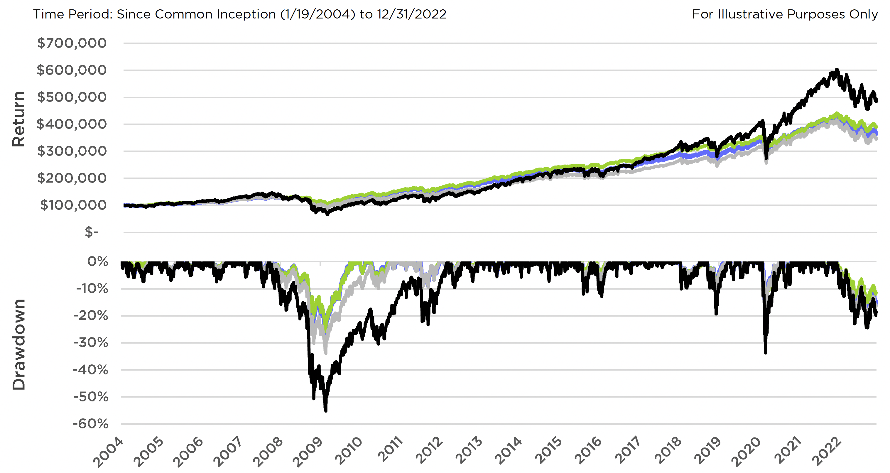 The addition of a tactical high yield strategy and a market neutral strategy, like the Counterpoint Tactical Income Fund and the Counterpoint Tactical Equity Fund respectively, to a portfolio further improved upon the benefits associated with stocks and bonds. Returns were higher than the traditional 60/40 portfolio but lower than the 100% stock portfolio, while max drawdown showed meaningful improvement. The chart below shows how these dynamics play out for investors over time.