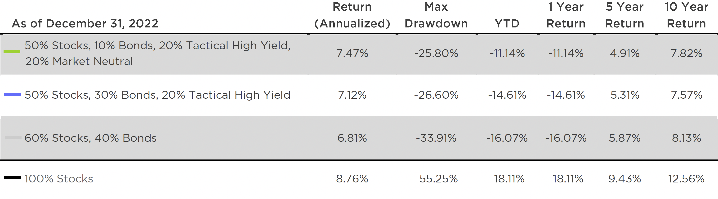Source: Bloomberg, Morningstar. The 100% Stocks Portfolio is completely composed of the S&P 500 Index. The 60% Stocks, 40% Bonds Portfolio is made up of the S&P 500 and Bloomberg Barclays Aggregate Bond Index. The 50% Stocks, 30% Bonds, 20% Tactical High Yield Portfolio is composed of the S&P 500, Bloomberg Barclays Aggregate Bond Index, and the Tactical High Yield 200-DMA. The 200-DMA Tactical HY is defined by buying the Morningstar High Yield Category when it closes above its 200-day moving average the prior day. The strategy entirely switches to exposure of the Bloomberg US Treasury 3-5 Year Index when the Morningstar High Yield Category closes below its 200-day moving average. “Market Neutral” is entirely composed of the J.P. Morgan Equity Risk Premium - Global Balanced Multi-Factor (Long / Short) US (JPQFMFWA) Index. It is not possible to invest an index. The data shown does not reflect or compare features of an actual investment, such as its objectives, costs and expenses, liquidity, safety, guarantees or insurance, fluctuation of principal or return, or tax features. Past performance is no guarantee of future results.